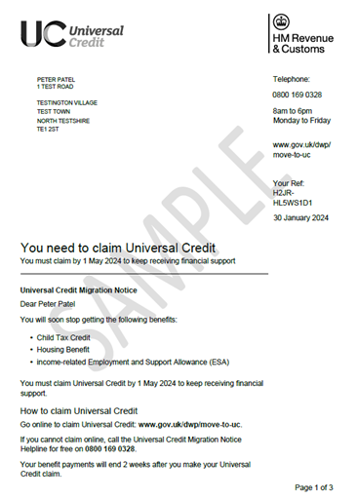 If the letter states a deadline to claim Universal Credit, then it is a Migration Notice letter. It will read: “This is a migration notice issued under regulation 44 of the Universal Credit (Transitional Provisions) Regulations 2014.”